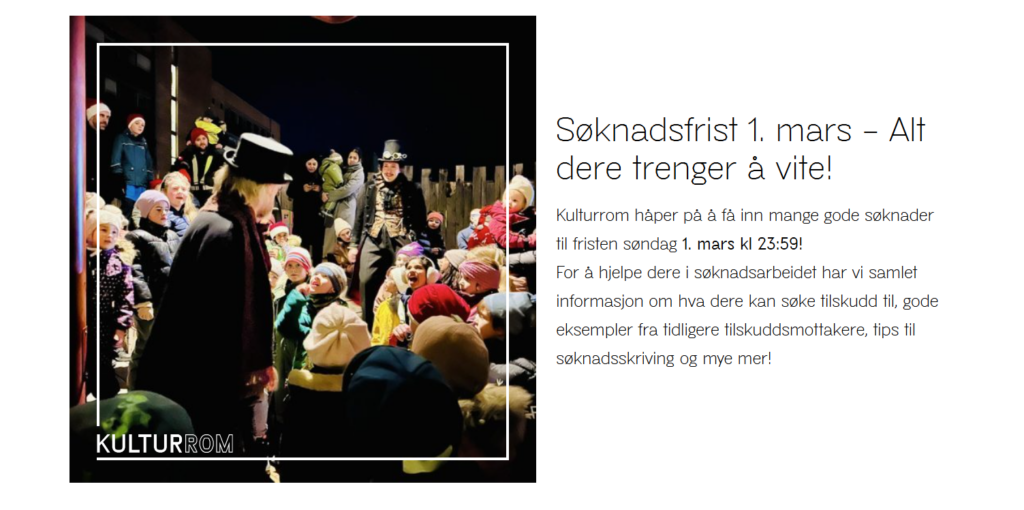 For å hjelpe dere i søknadsarbeidet har Kulturrom samlet informasjon om hva dere kan søke tilskudd til, gode eksempler fra tidligere tilskuddsmottakere, tips til søknadsskriving og mye mer!